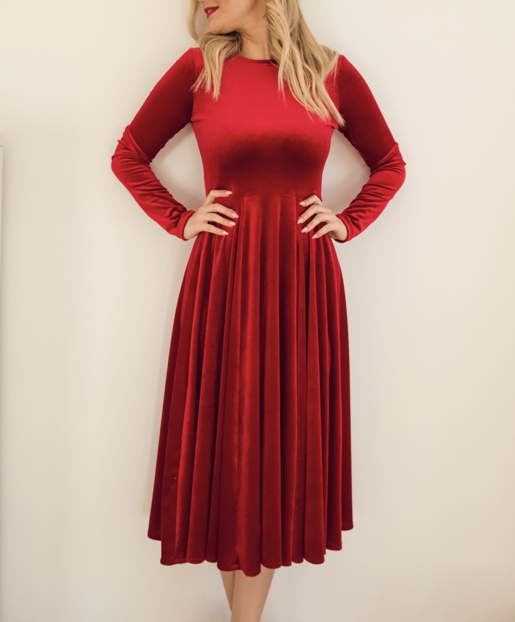 Dress Lady is perfect Christmas dress. Made from soft and elastic velvet, available in red, black, dark blue, dark green, bordeaux. Length is midi 125 cm.