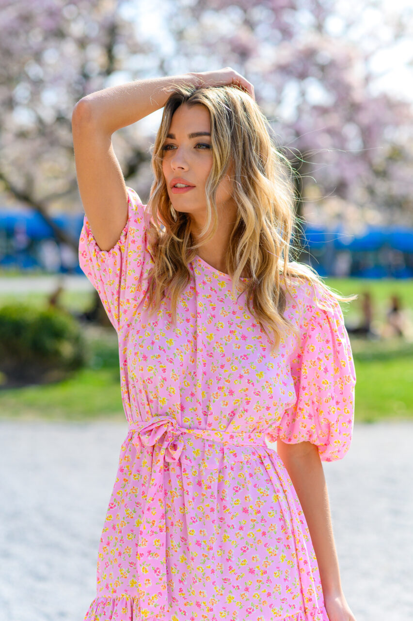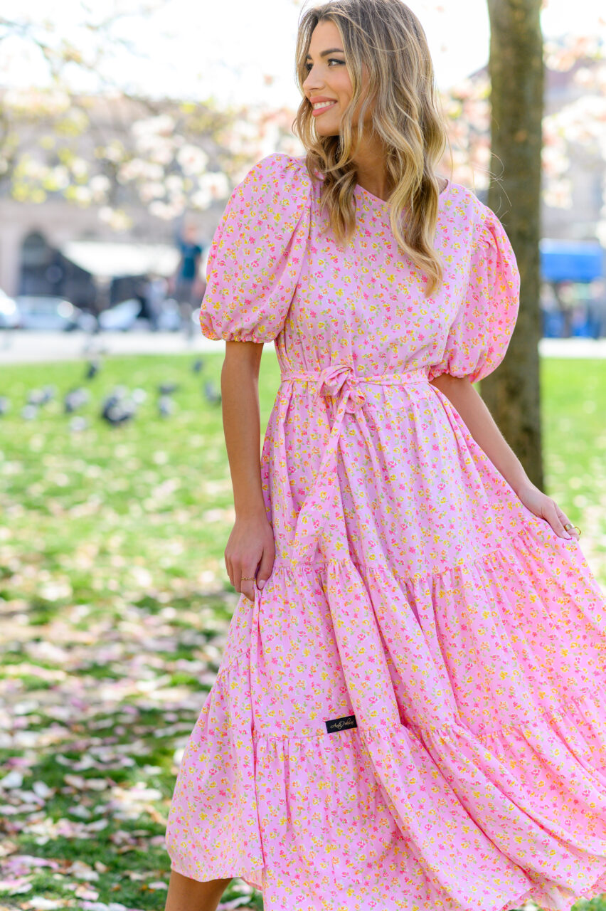 Dress LARA is airy, light and has amazing skirt flounces. Puff sleeves, wide skirt and belt that comes with, made it unique.