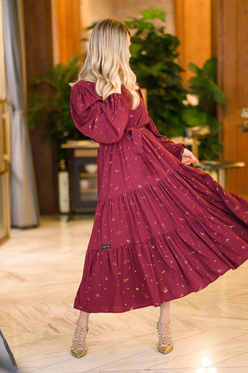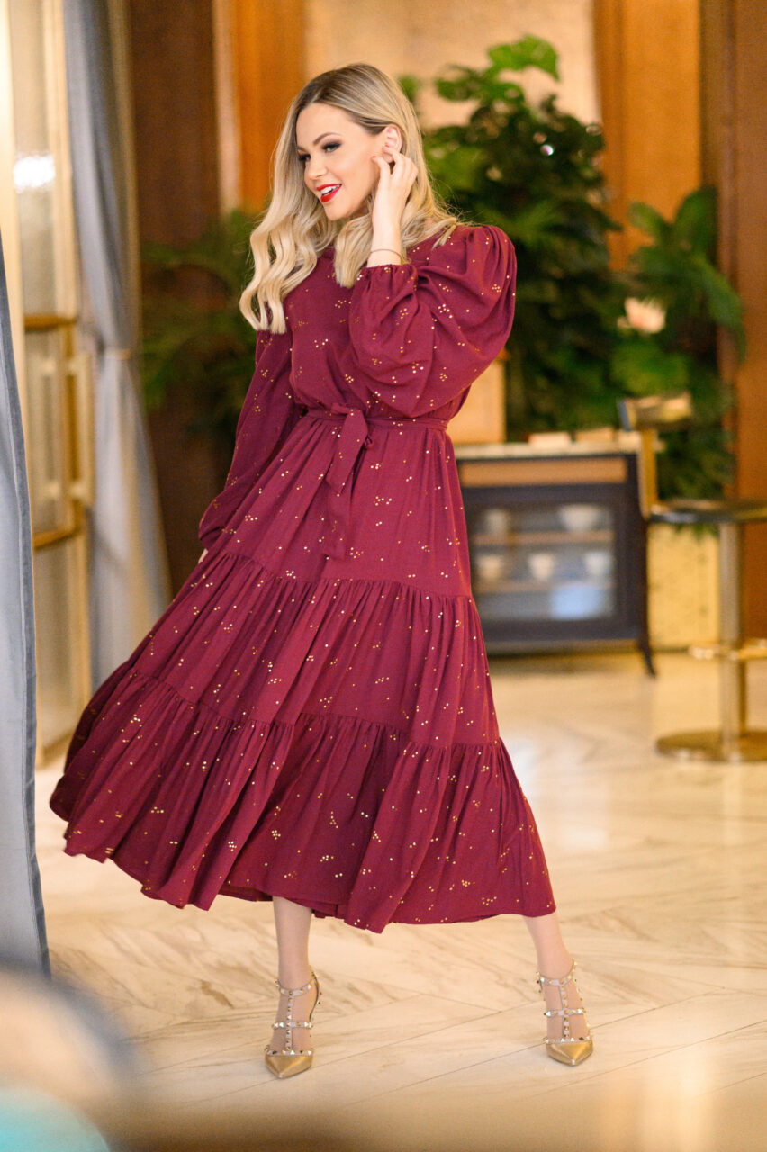 DRESS LARA is made from high quality radiance. It is perfect Holiday dress. Length is midi, 125 cm. Dress LARA is airy, light and has amazing skirt flounces. Puff long sleeves, wide skirt and belt that comes with, made it unique.