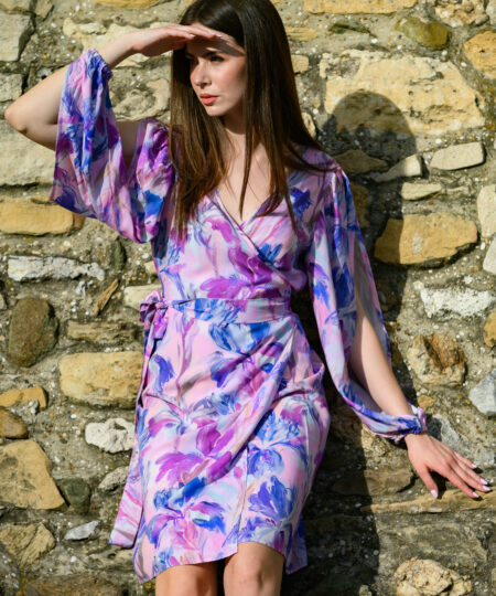 the LEONIE dress is feminine and sensual. It's made from 100% high quality viscose with wrap design. The emphasis is on its slit sleeves to accentuate the beauty of the arms. The lilac print makes it a simple yet unforgettable dress for Summer celebrations.