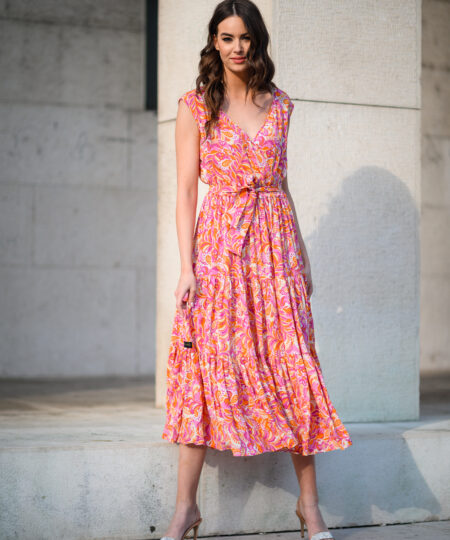 Dress Rachel is airy, romantic, light and has amazing skirt flounces. Upper part of dress is wrapped. Amazing print and combination of colors, will accentuate Your tanned skin. Wide skirt and belt that comes with, made it unique.