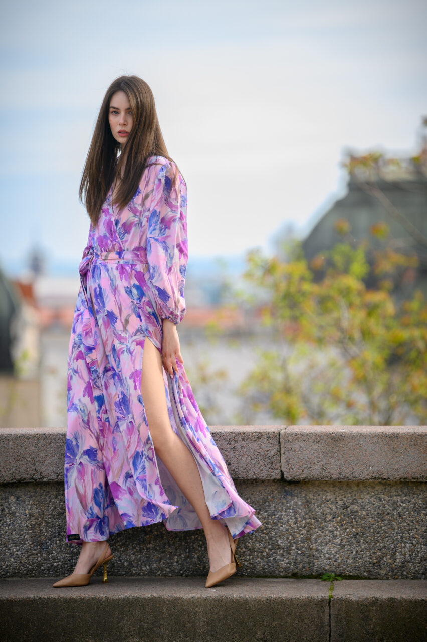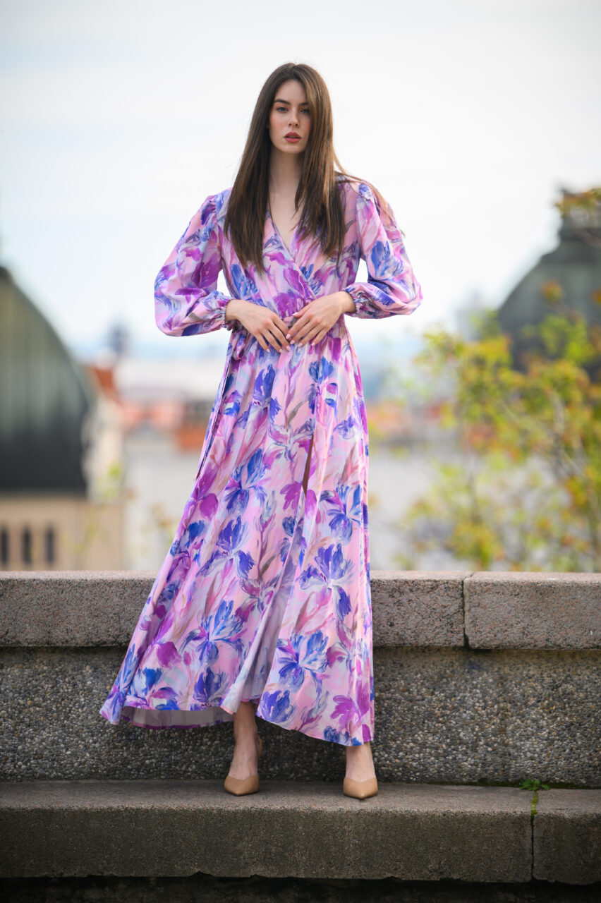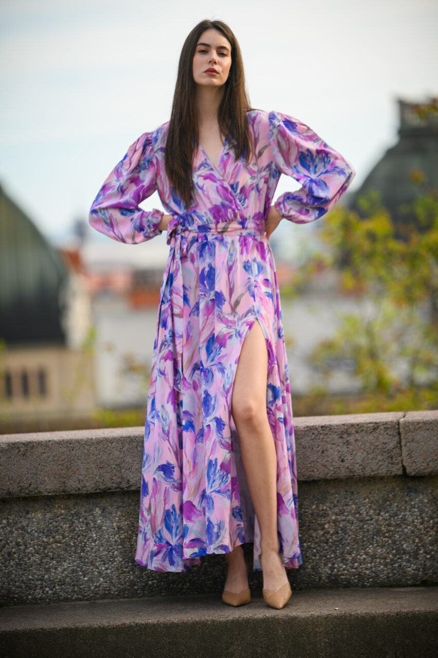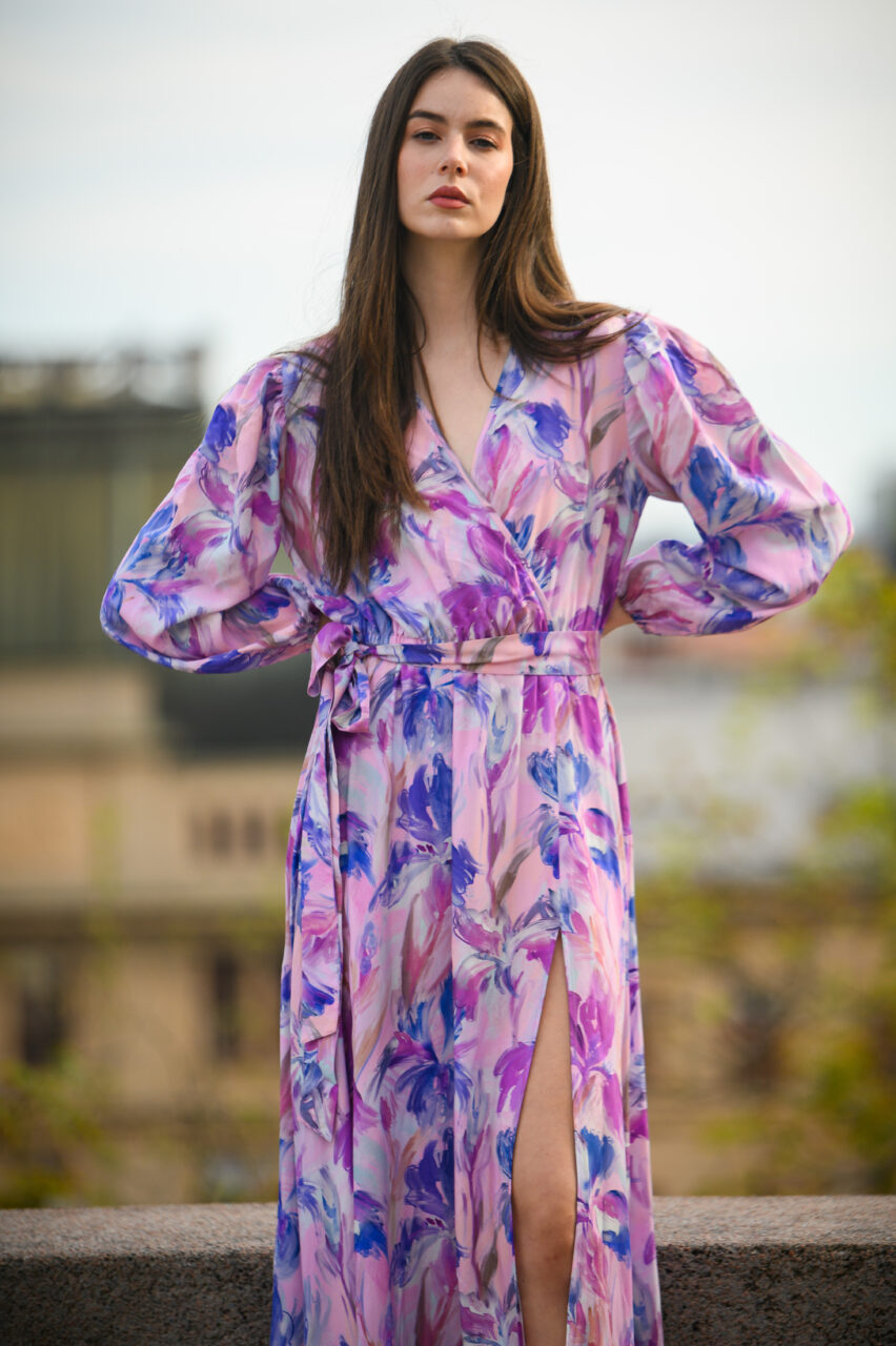 DRESS Emily is made from high quality radiance. The upper part of the dress is wrapped and has big puf sleeves.