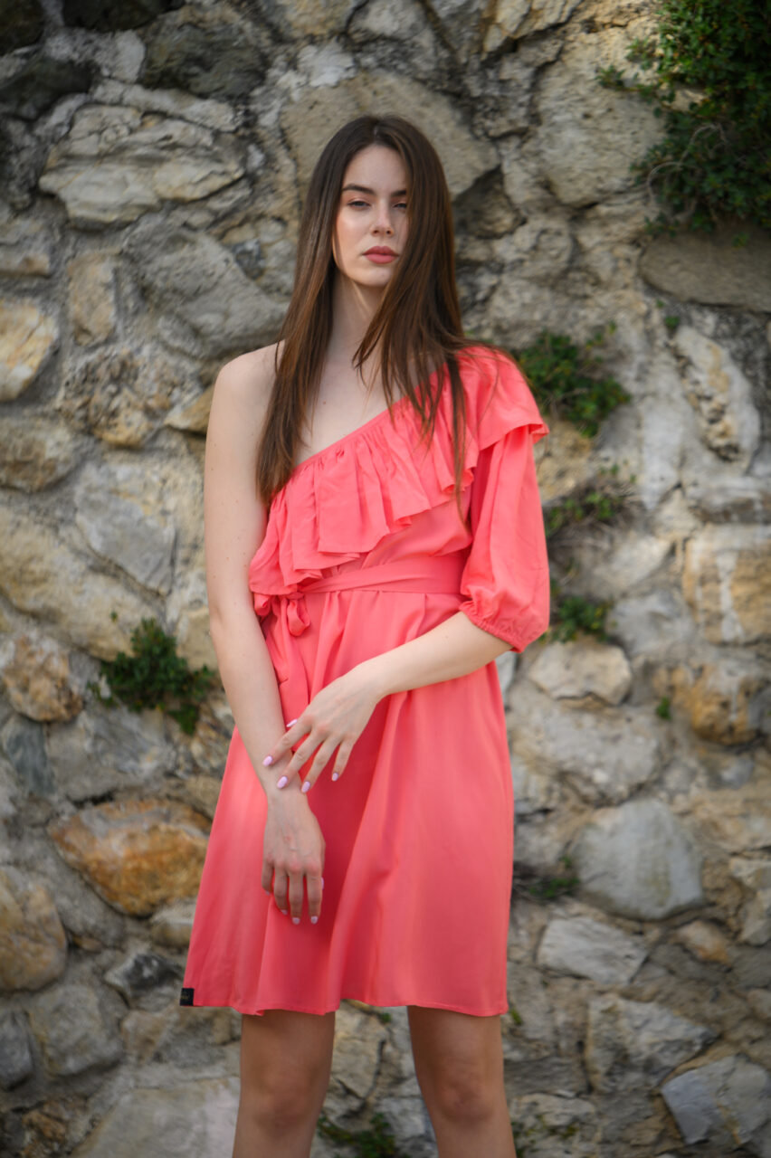 Dress Georgia is airy, light and romantic. One-shoulder design with a ruffled trim on upper part of the dress made it unique. You can accentuate Your waist with the belt that comes with.