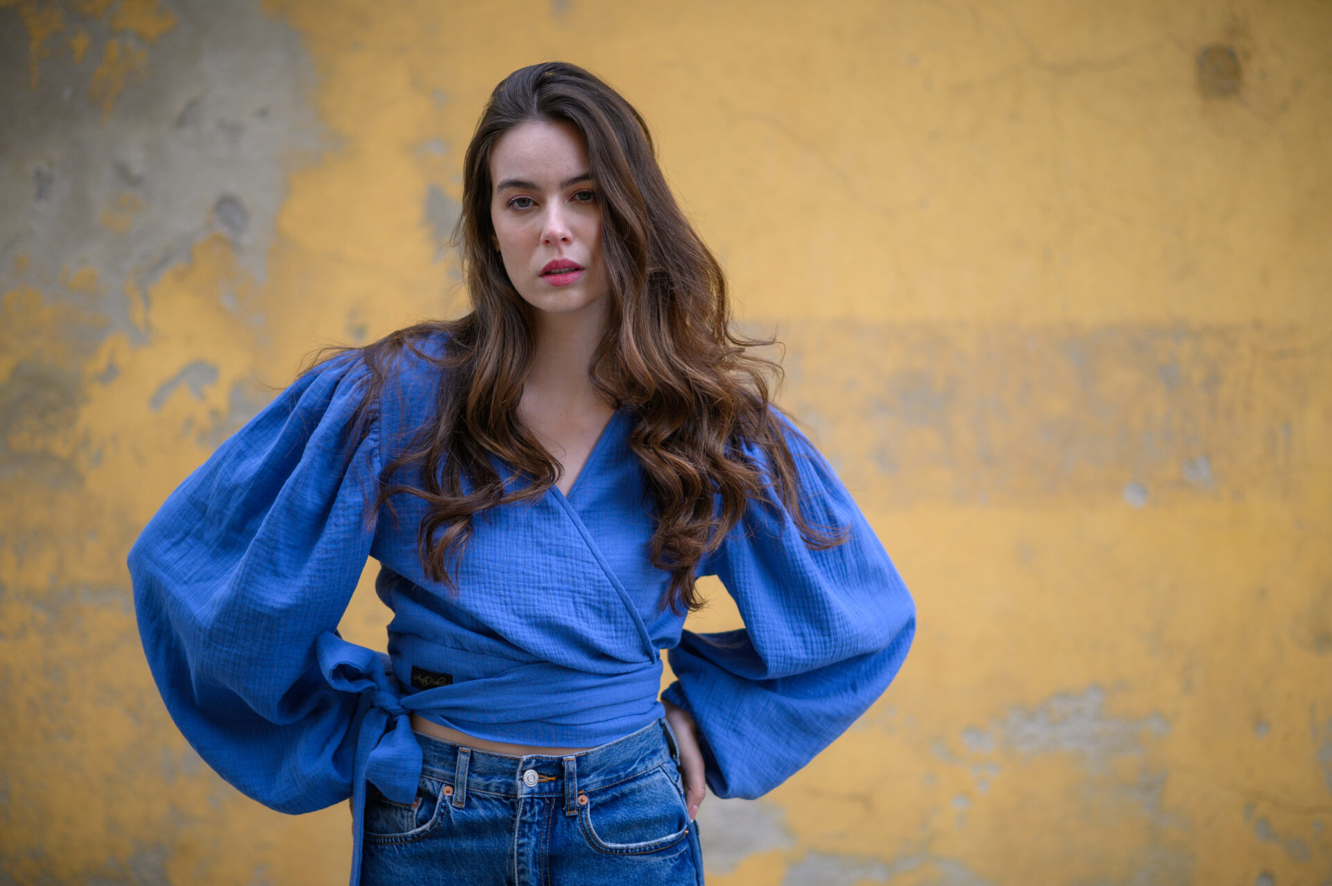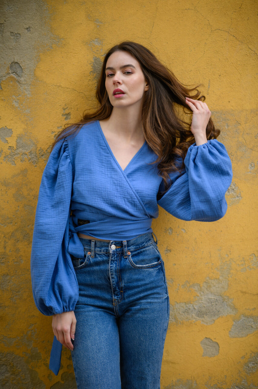 SHIRT is made from high quality double gauze cotton (OEKO-TEX/STANDARD 100). SHIRT is airy, light, oversized and has big puf sleeves. Wrap design with tie around waist made it unique. It pairs perfectly with jeans, skirts or shorts.